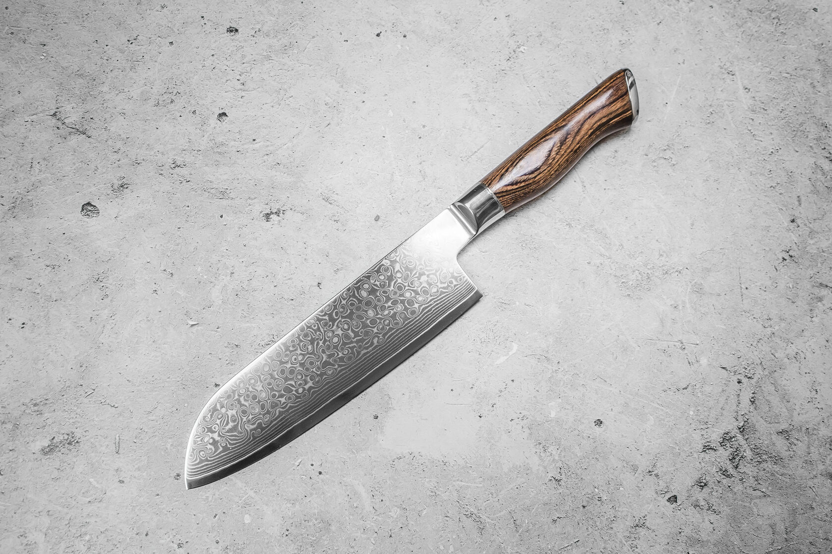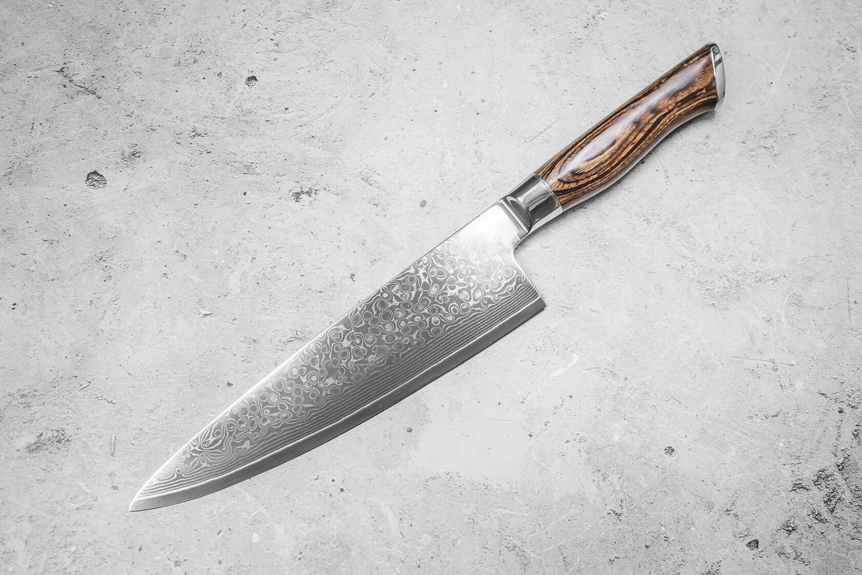 Каждый мой нож выкован вручную из 67 слоев дамасской стали. В центре находится премиальный слой из стали VG-10 — она великолепно держит остроту, но менее устойчива к ударам. Чтобы защитить ее, я добавляю с обеих сторон по 33 слоя стали 4116. Эта сталь очень прочная, легко поддается заточке и, благодаря особой технике ковки, создает на клинке завораживающий узор с переливами. В результате такой комбинации нож не только сохраняет заточку более полугода, но и остается устойчивым к повреждениям и коррозии.